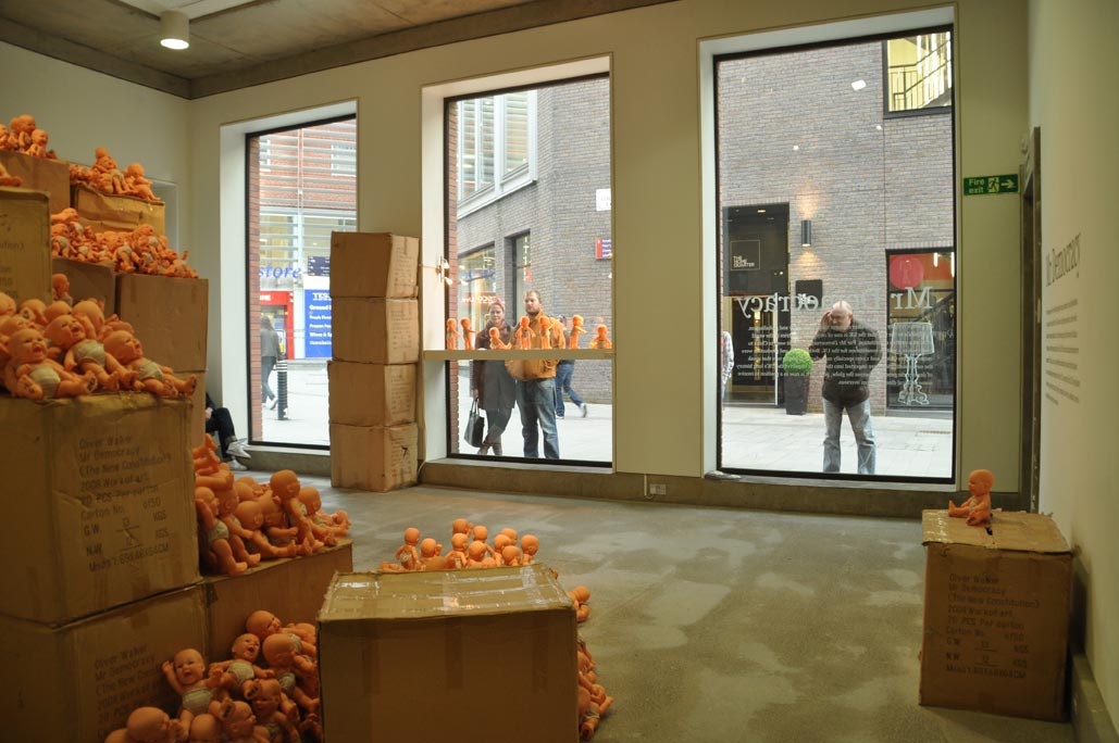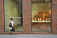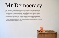Mr Democracy explores trade, democracy and globalisation. It responds to the fact that the UK is one of only three countries in the world without a written constitution. For Mr Democracy, the artist went to China to commission a written constitution for the UK. Both content and production were outsourced to China, and 1,000 specially manufactured plastic toys that speak the new constitution were imported into the UK. In respect of the UK's long history of democratic generosity across the globe, perhaps it is now in a position to receive some political direction from overseas.