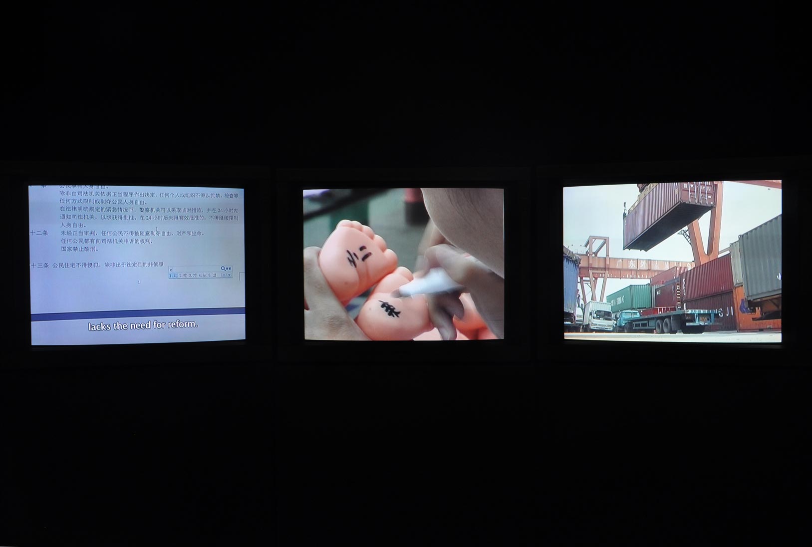 The constitution developed in Shanghai was then mass produced in the form of 1,000 dolls which speak the constitution (known as The New Constitution) when pressed. This video documents work in three factories: one (in Shantou, south China) which produces the plastic molded toy, a second which makes the voice chip/circuit board for speaking the constitution, and a third which installs and tests the voice chip (in Guangzhou, south China).