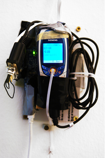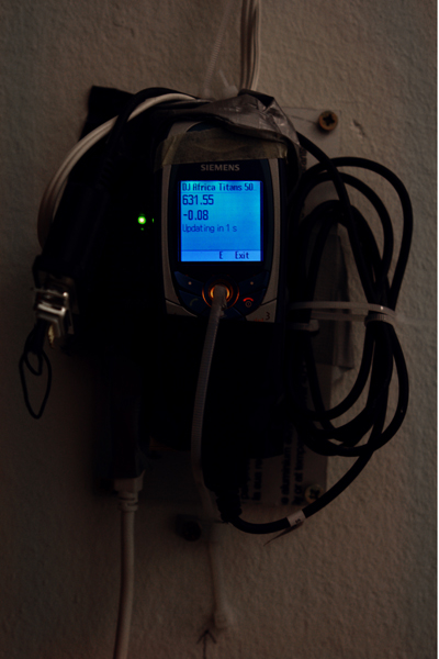 These connections are produced through the use of a custom built device which uses a GPRS capable mobile phone to read live online financial data feeds, and which in turn controls an everyday object, such as the lighting circuit in a corridor. These interventions interrupt the operation and usage of this device for the viewer, potentially causing an inconvenience. The device reads the Dow Jones Africa Titans 50 index, which ‘measures the stock performance of 50 leading companies that are headquartered or generate the majority of their revenues in Africa.’ The device was made together with software engineer Hamilton Gross.